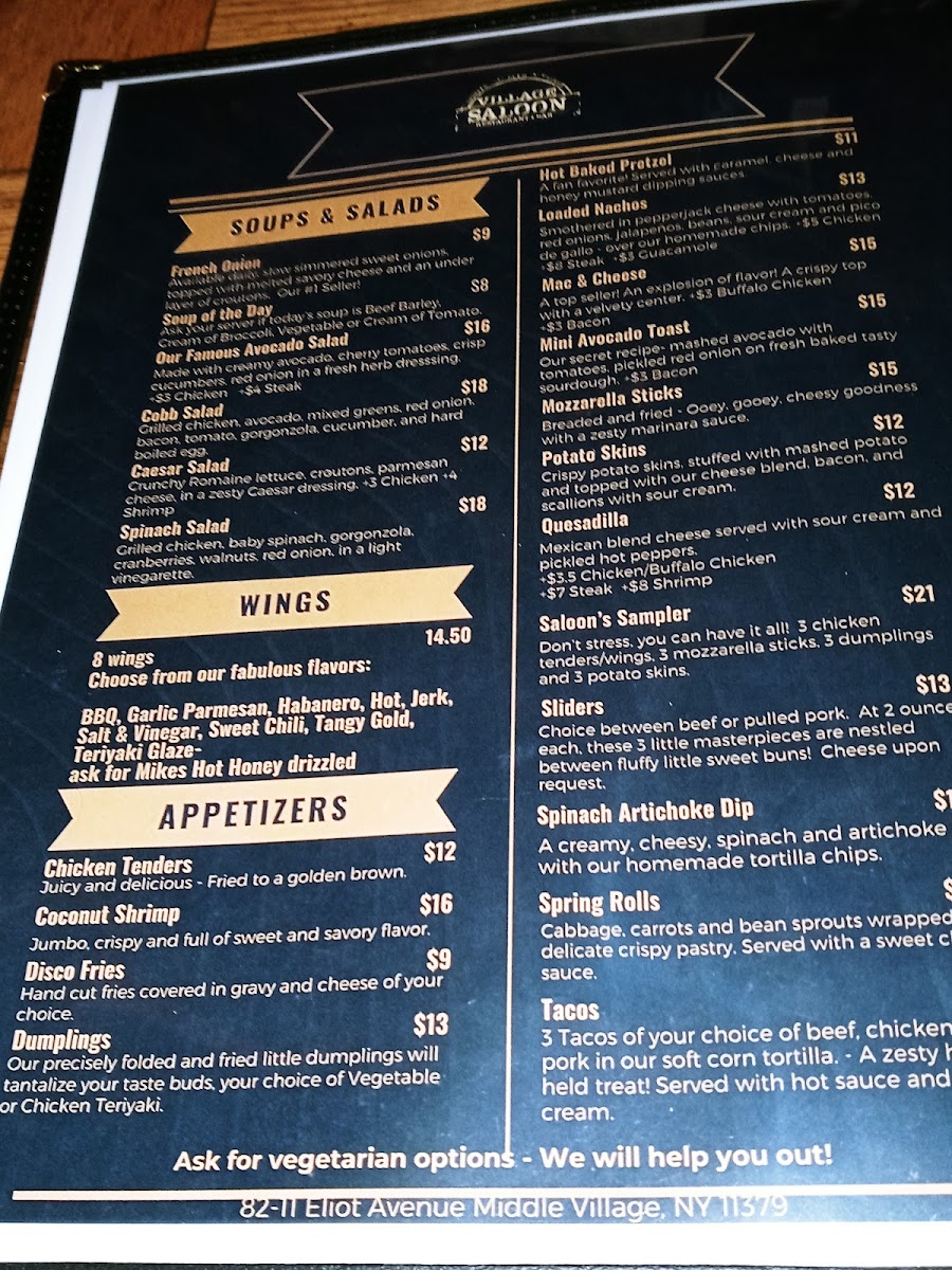 Welcome to The Village Saloon, a hidden gem nestled in Middle Village, NY. This restaurant offers a menu that seamlessly blends classic fare with fresh ingredients, ensuring each dish is made to perfection. Start your meal with one of their refreshing salads, like the creamy Avocado Salad or the classic Caesar.